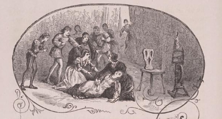The first thing he saw was enough to freeze him with fear. Bodies of men and horses lay extended on the ground; but the men had faces, not death- white, but red as roses, and beside them were glasses half filled with wine, showing that they had gone to sleep drinking. Next, he entered a large court paved with marble, where stood rows of guards presenting arms, but as still as if cut out of stone; then he passed through many chambers where gentlemen and ladies, all in the dress of the past century, slept at their ease, some standing, some sitting. The pages were lurking in corners, the ladies of honor were stooping over their embroidery frames or listening to the gentlemen of the court; but all were as silent and as quiet as statues. Their clothes, strange to say, were fresh and new as ever; and not a particle of dust or spider-web had gathered over the furniture, though it had not known a broom for a hundred years. Finally, the astonished prince came to an inner chamber, where was the fairest sight his eyes had ever beheld.
